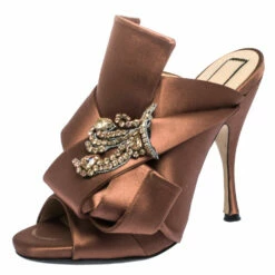 One look at this pair of N°21 mules and our hearts skip a beat. These beautiful mules have been styled with perfection just so a diva like you can flaunt them. Brown in shade, the pair has been designed with big knots and embellishments on the satin uppers. They’ll look amazing with all your dresses this season.