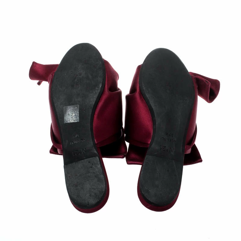 Supremely comfortable and stylish, these mules from the house of N21 features a burgundy-colored satin body. It comes with a knotted front and an open-toe silhouette that lend it an interesting shape. Style with culottes or cropped trousers for a comfortable yet on-trend look.
