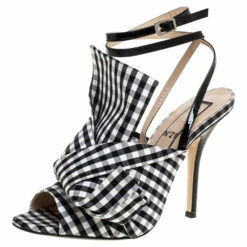 Do not miss out this unique pair of sandals from N°21. With a checked print shaping the peep-toe upper in black and white, it has the signature knotted detail. This creation is complete with adjustable ankle straps and stiletto heels.