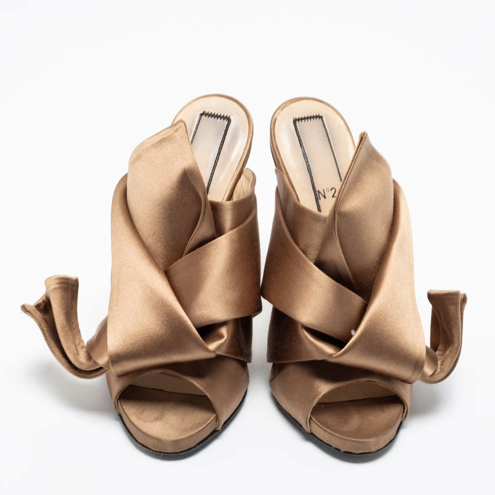 Characterized by exaggerated knots, the Nº21 mules are a statement pair and can take your look to a whole new level. They are skillfully crafted from satin in a light brown hue and feature peep-toes. These mules are elevated on slender heels for a chic finish.