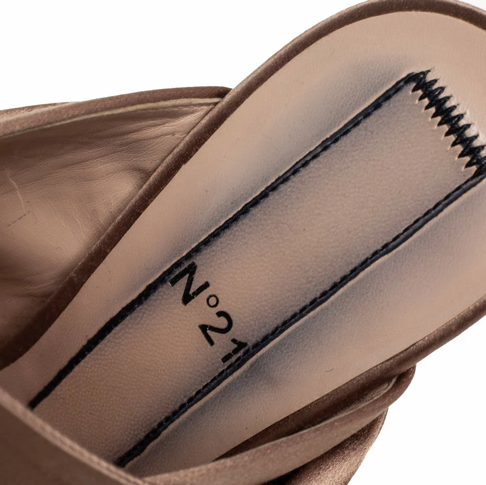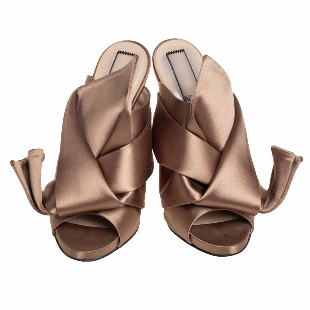 Characterized by exaggerated knots, the Nº21 mules are a statement pair and can take your look to a whole new level. They are skillfully crafted from satin in a brown shade and feature peep-toes. These mules are mounted on 12 cm heels and offer maximum comfort while walking.
