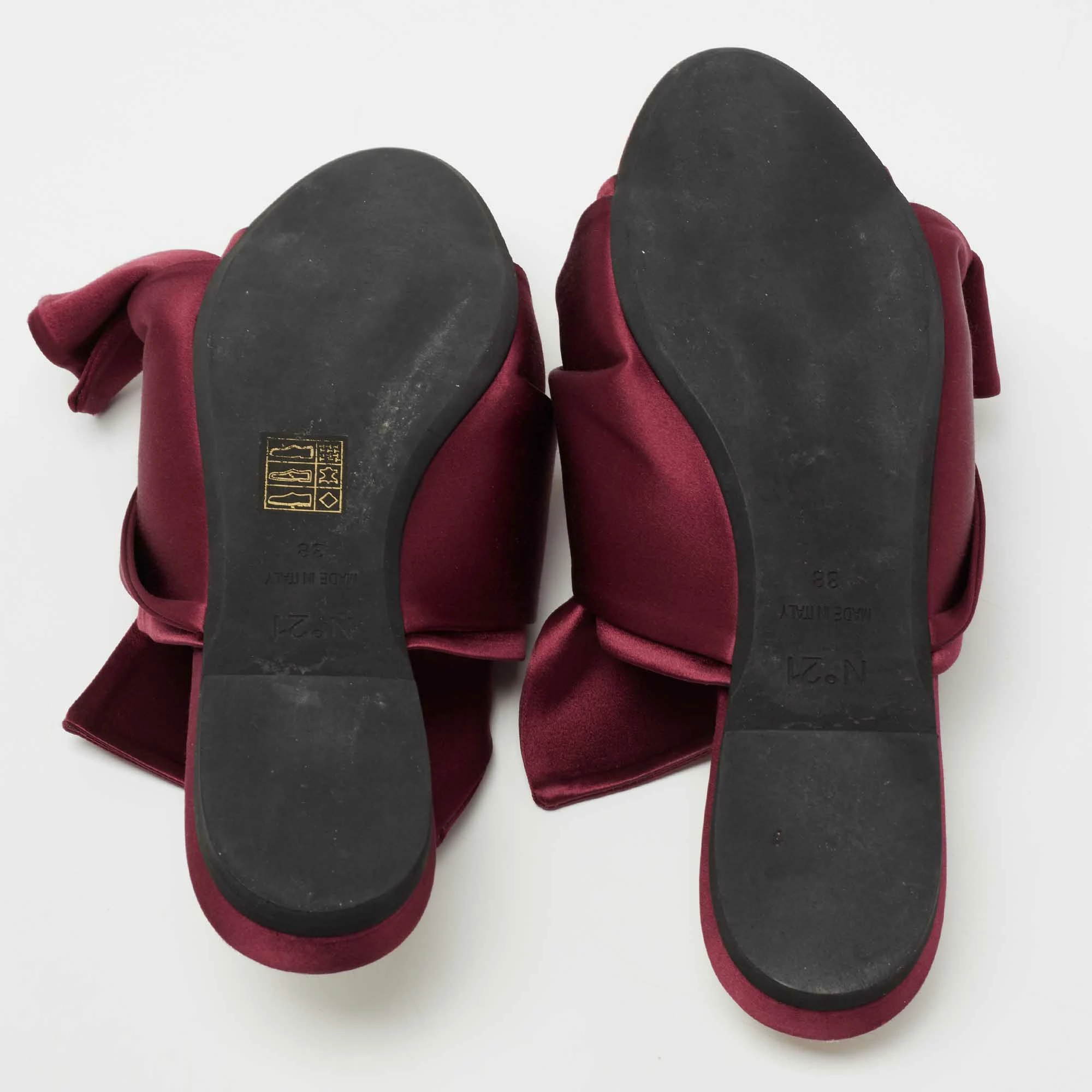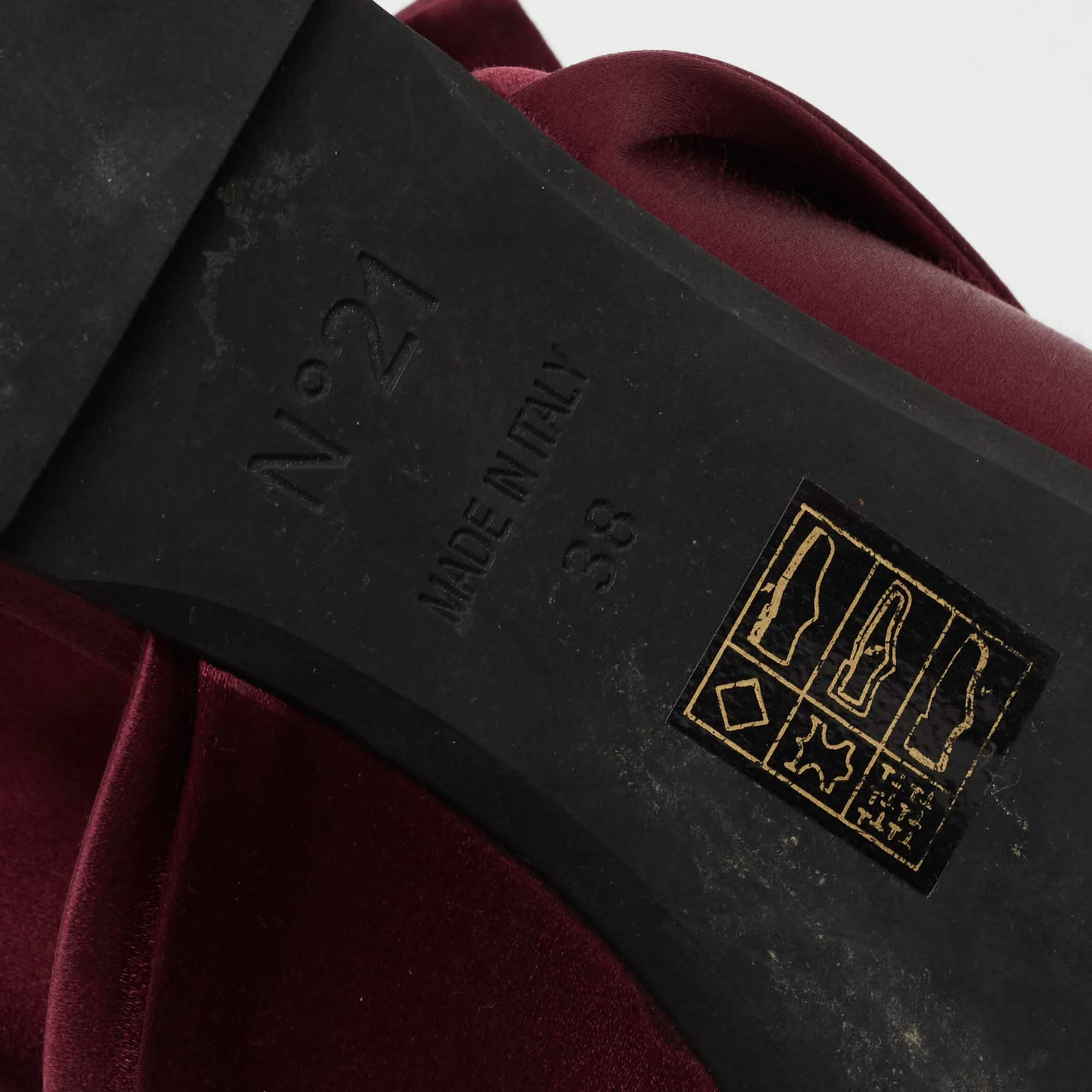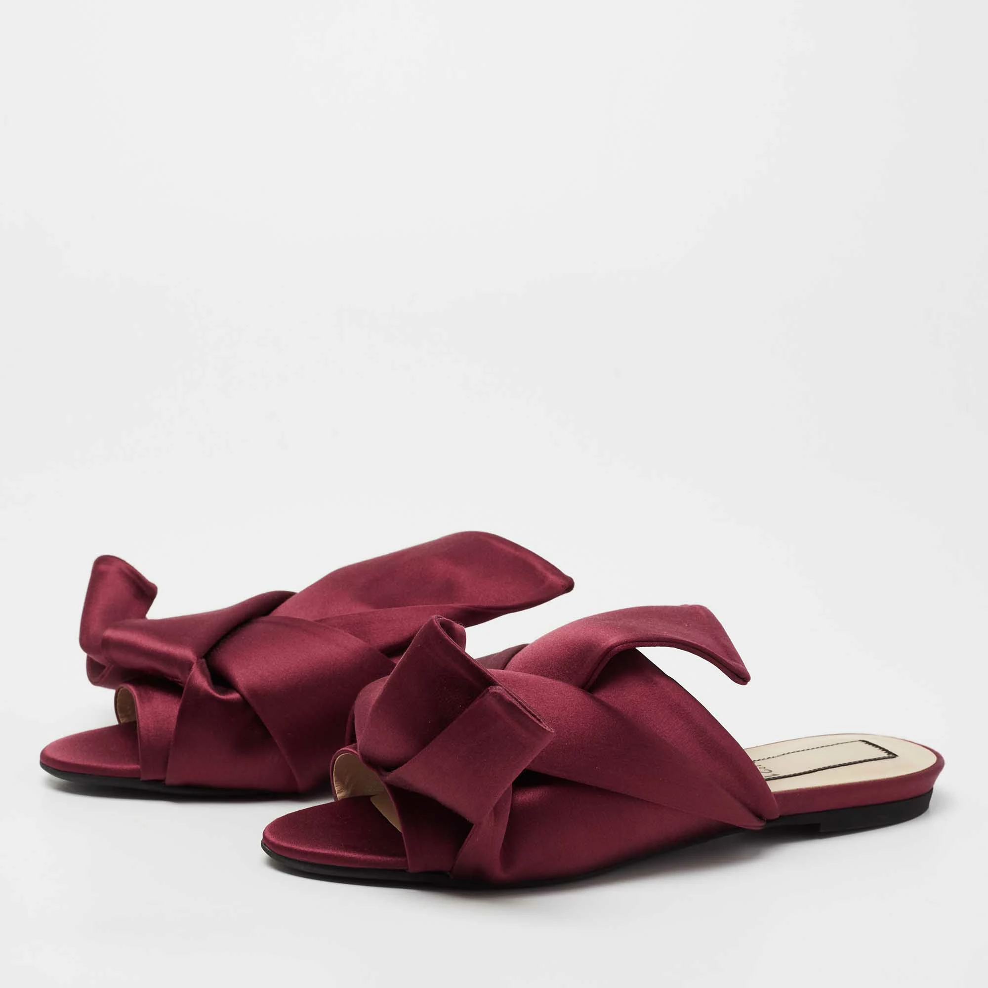 Characterized by exaggerated knots, the Nº21 flats are a statement pair and can take your look to a whole new level. They are skillfully crafted from satin in a burgundy shade and feature open-toes. These slides are equipped with comfortable insoles that offer maximum comfort while walking.