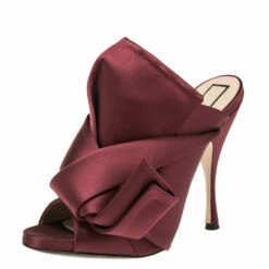 Characterized by exaggerated knots, the Nº21 mules are a statement pair and can take your look to a whole new level. They are skillfully crafted from satin in a burgundy hue and feature peep-toes. These mules are elevated in slender heels for a chic finish.