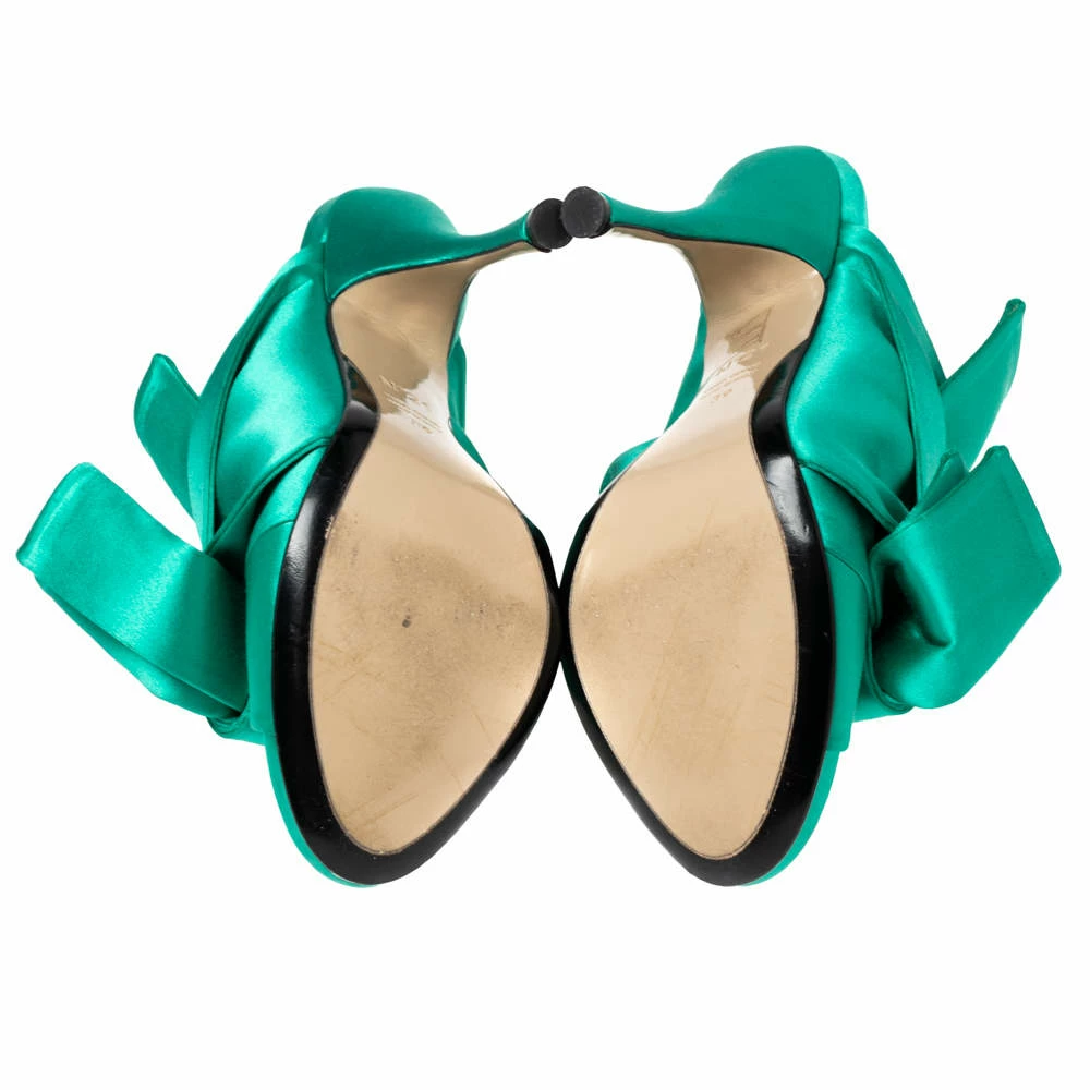 Characterized by exaggerated knots, the Nº21 mules are a statement pair and can take your look to a whole new level. They are skillfully crafted from satin in a green shade and feature peep-toes. These mules are mounted on 12.5 cm heels and offer maximum comfort while walking.