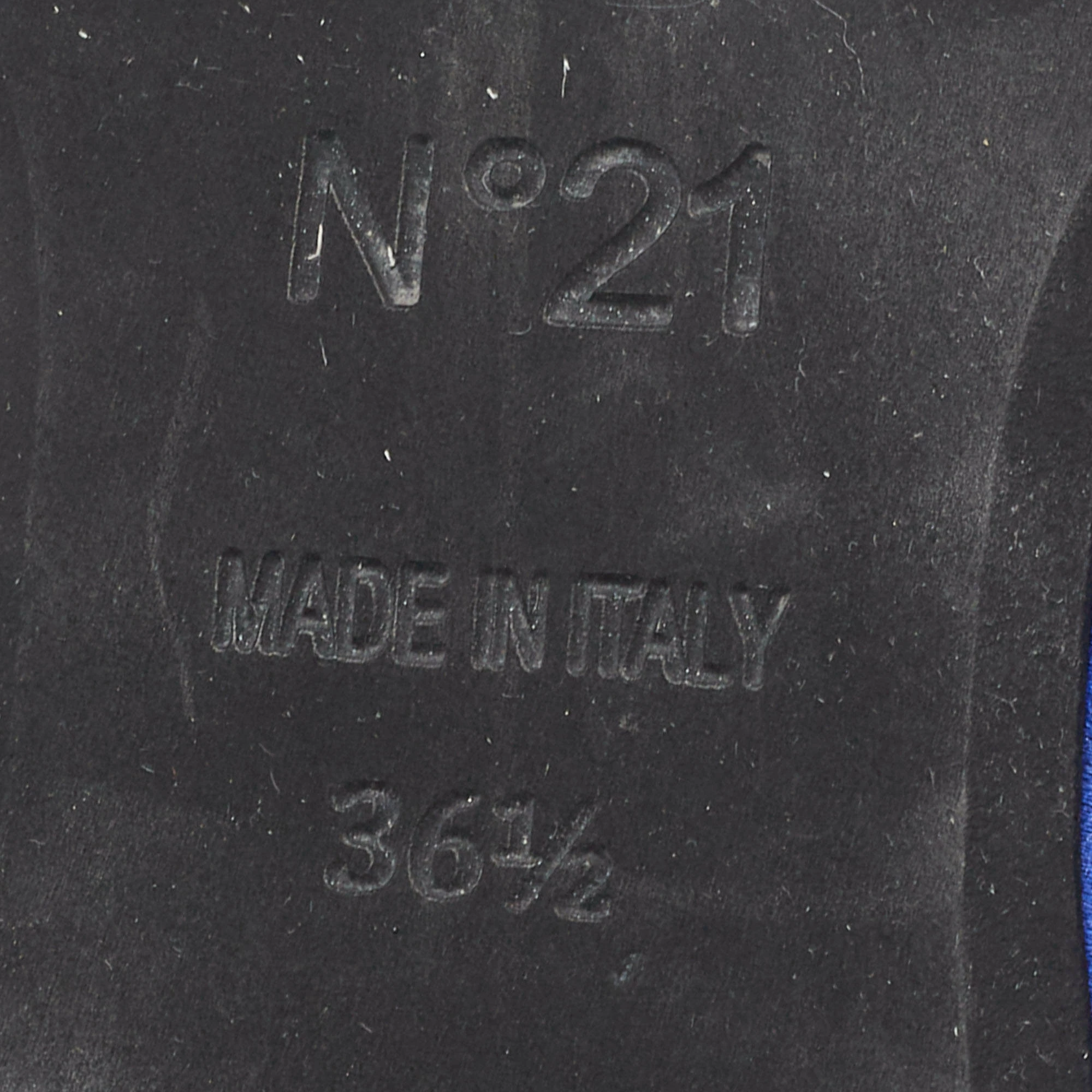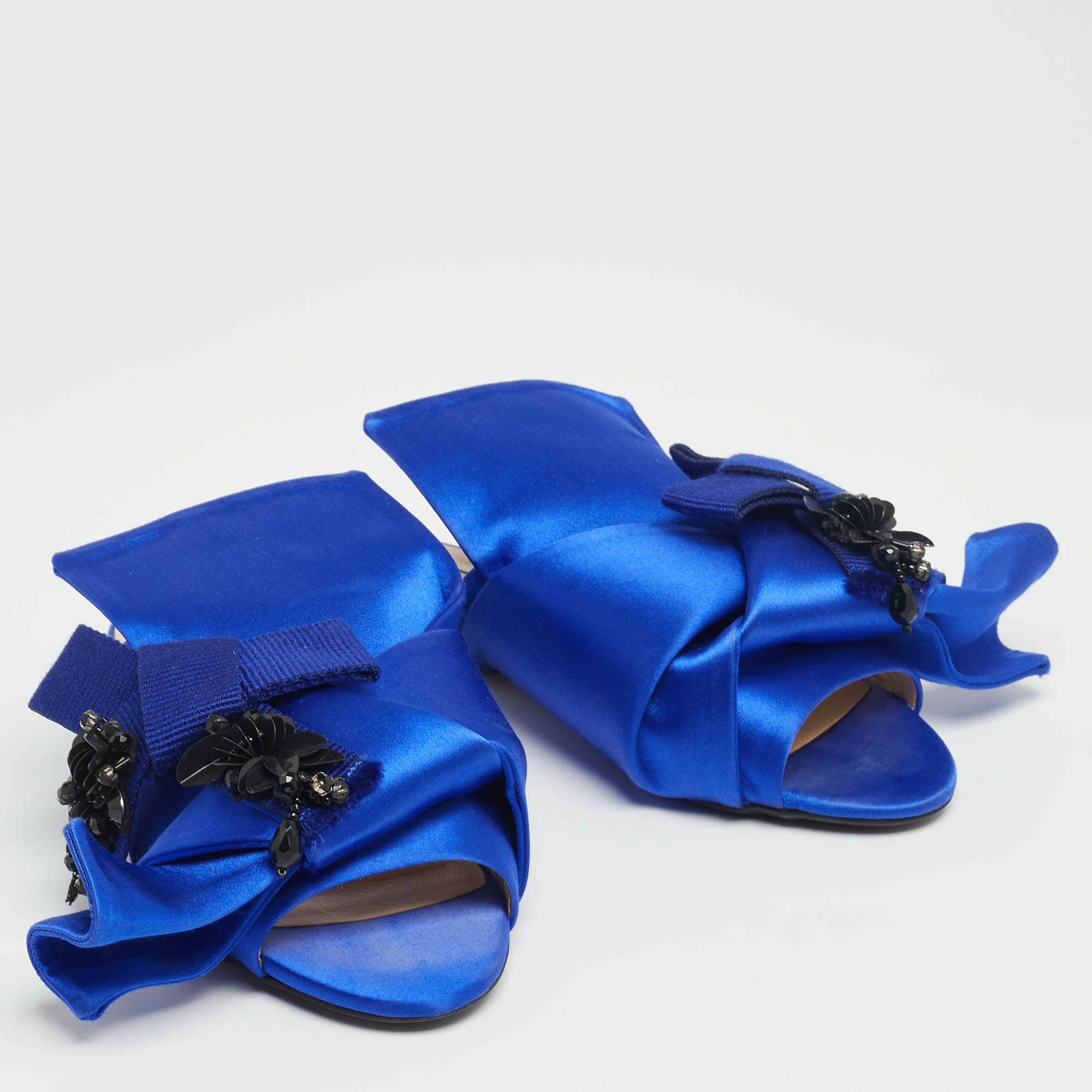 Supremely comfortable and stylish, these mules from the house of Nº21 feature a royal blue satin body. It comes with a knotted front, embellishments, and an open-toe silhouette that lend it an interesting shape. Style with culottes or cropped trousers for a comfortable yet on-trend look.
