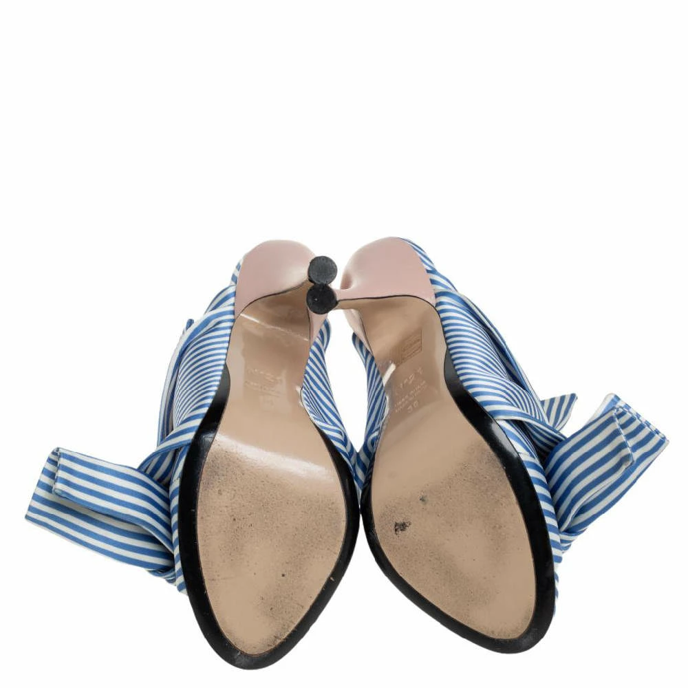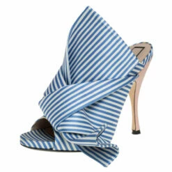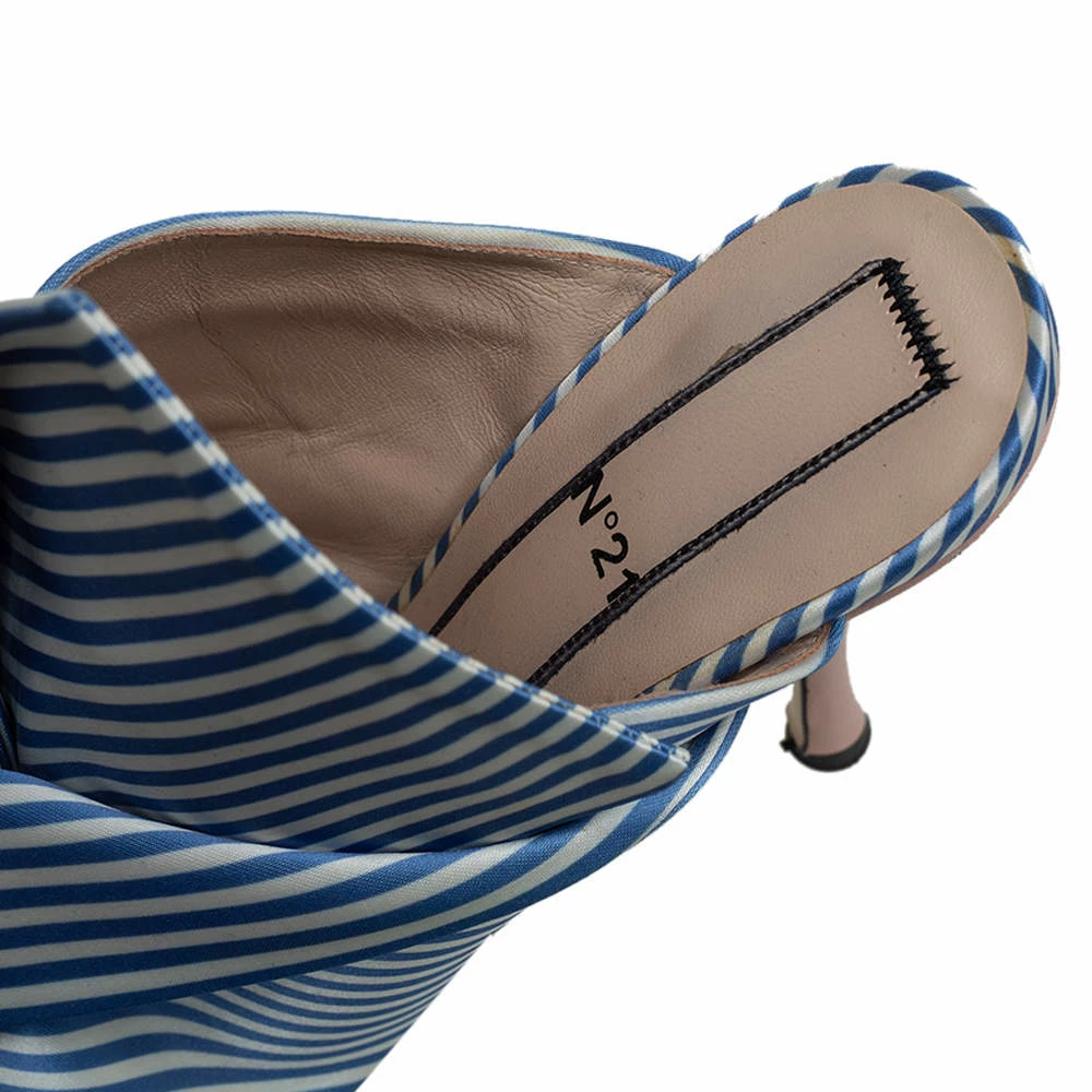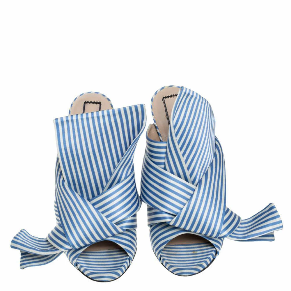 Characterized by exaggerated knots, the Nº21 mules are a statement pair and can take your look to a whole new level. They are skillfully crafted from satin in a striped design and feature peep-toes. These mules are mounted on 12 cm heels and offer maximum comfort while walking.