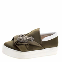 Let your latest shoe addition be this pair of olive green slip-on sneakers from N21. They’ve been crafted from satin and styled with crystal embellishments on the front bows. They are complete with comfortable leather insoles.